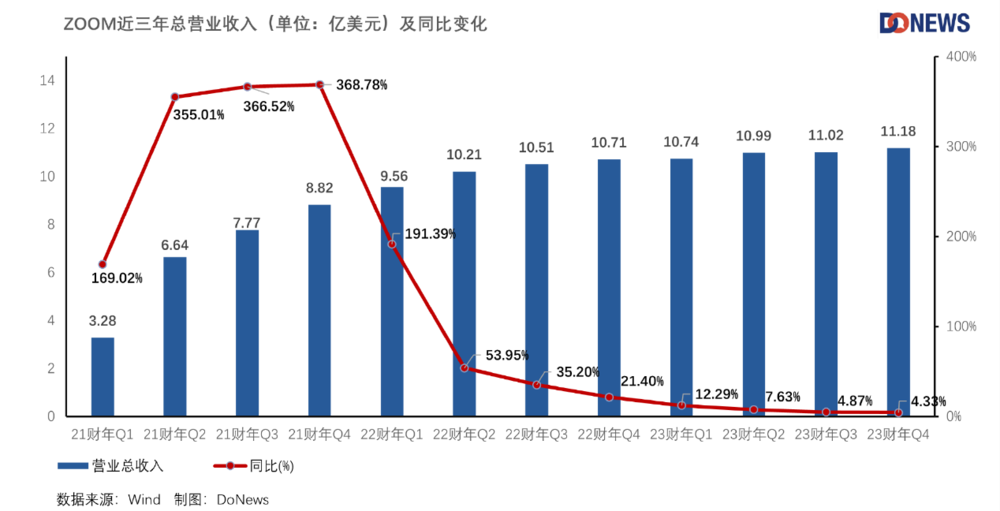 數據顯示,ZoomQ4的總營收為11.178億美元,與上年同期的10.714億美元相比,僅增長4%,去年同期為21.4%,也低於上一季度4.9%的增速。2023財年,Zoom的總營收為43.930億美元,與上一財年的40.999億美元相比增長了7%,但是去年的增速為54.6%。可見疫情漸漸放開後,Zoom的高增長也成為歷史。