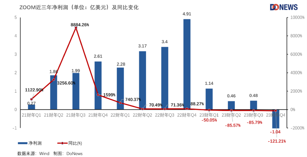 2022財年第四季度,Zoom的淨利潤達到頂峯4.91億美元,而僅一年的時間,就虧損超1億,同比降低121.21%。
