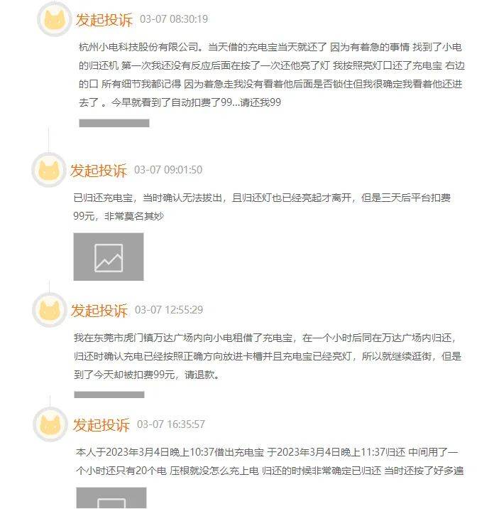 “我3月4號在北京時尚天街借了一個小電的充電寶,用了5分鐘歸還,最後兩天後説我剛剛歸還,扣費99元。”一消費者在黑貓投訴上表示。