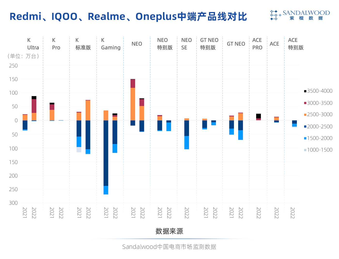 回顧前兩年電商中端產品線的表現,一加 Ace、Redmi K系列、真我GT NEO、 IQOO NEO的競爭不斷加強。