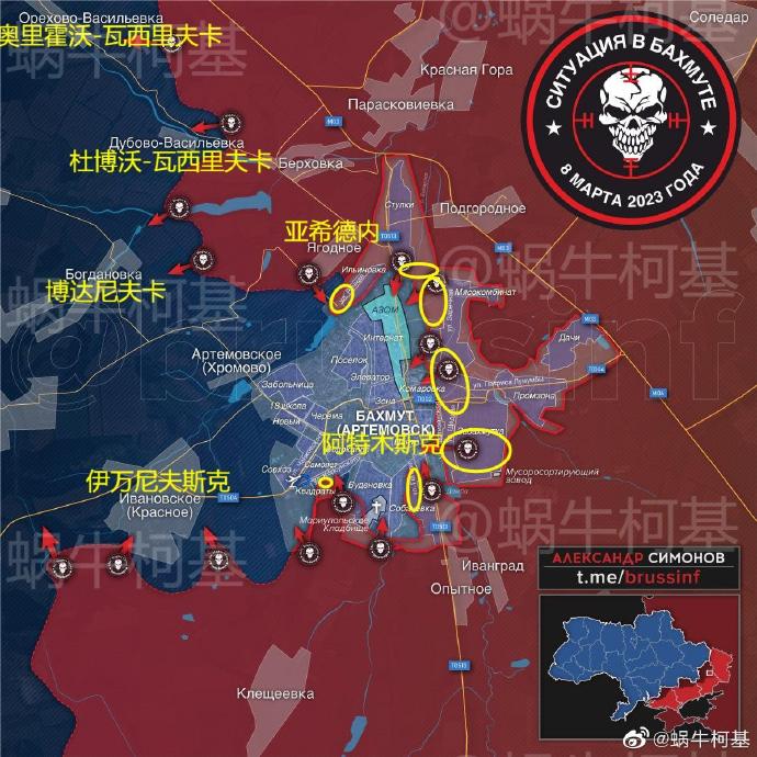 “3 月 8 日發佈的地理定位鏡頭顯示,瓦格納集團部隊在斯皮爾涅以東(克里米納東南 25 公里)取得了邊際進展。 ”