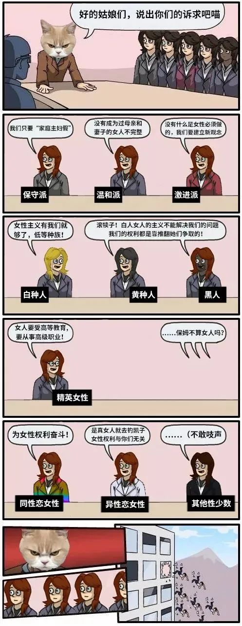 最初的女性主義,説白了是一種“順直白人女性主義”,性少數和有色人種的女性通常是被忽視的。第二波女性主義浪潮中非常有意義的一件事,就是將這些羣體囊括進來,形成了更大的女性陣營。