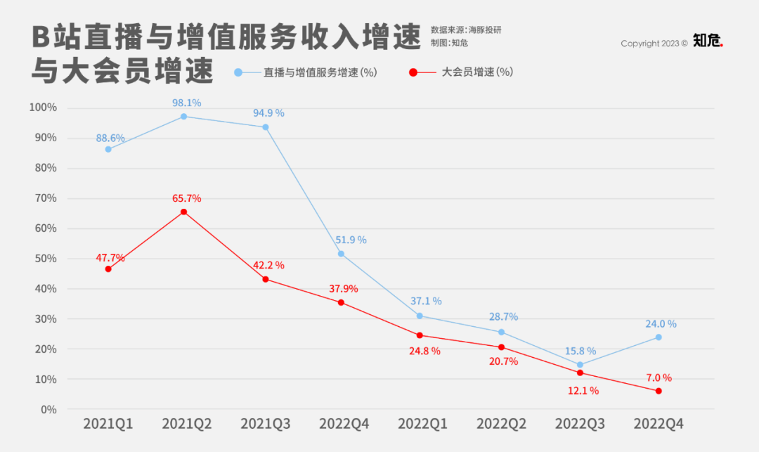 直播與增值服務收入方面,B 站雖然增速放緩,但依舊有不錯的增速: