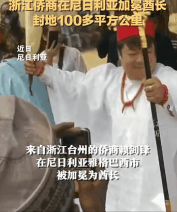 上個月28日,浙江台州的僑商賴劍鋒在尼日利亞榮封酋長,下屬封地100多平方公里、子民5000多户!成為了尼日利亞雅格巴西市的首位台州酋長,加冕當天受到了當地羣眾的熱情簇擁。