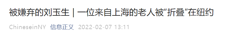 文章標題信息量很大,叫**《被嫌棄的劉玉生:一位來自上海的老人被“摺疊”在紐約》**。