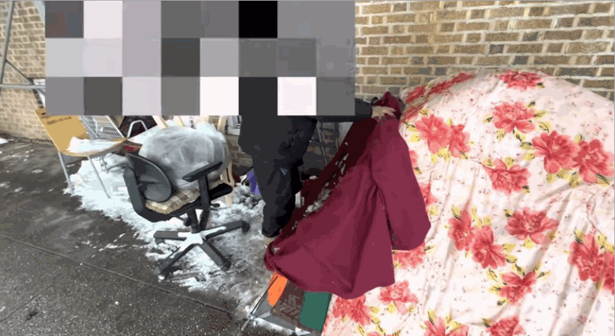 天氣好的時候,他坐在外面,會有路過的好心人給些吃的或留下錢;現在太冷了,人待不住,他縮在帳篷裏,得不到太多救濟。