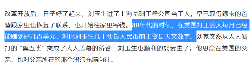 改革開放後,在美國取得綠卡的劉父和家裏恢復往來,偶爾寄錢回來。劉玉生因此得知,去美國打工可以月入幾百美元,對比自己幾十塊人民幣的工資,簡直天壤之別。
