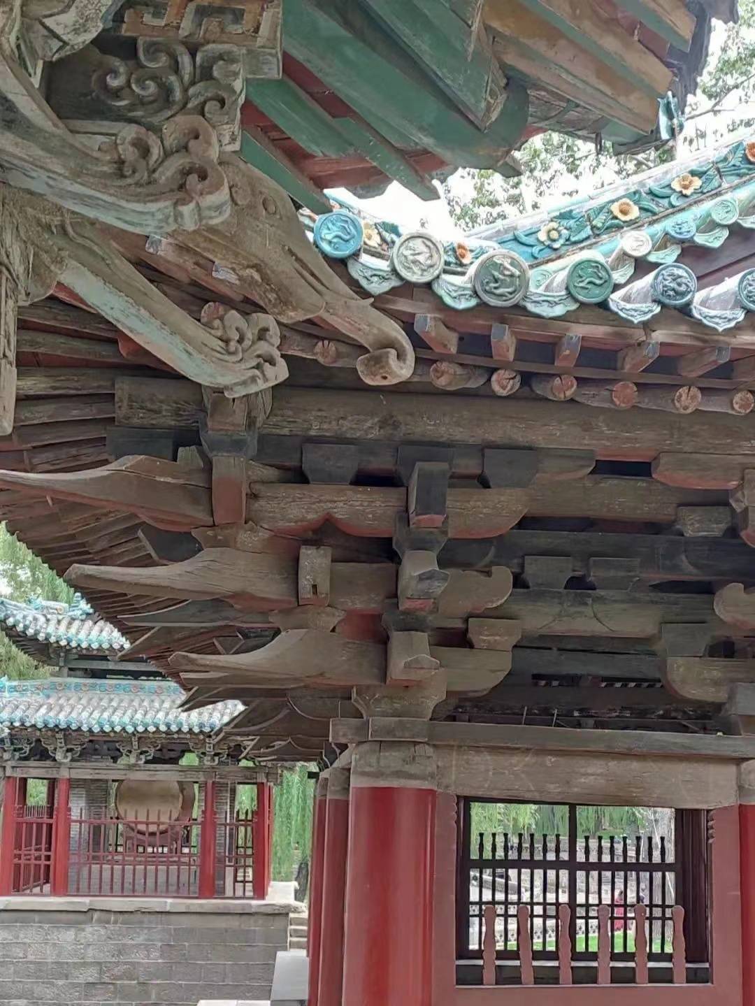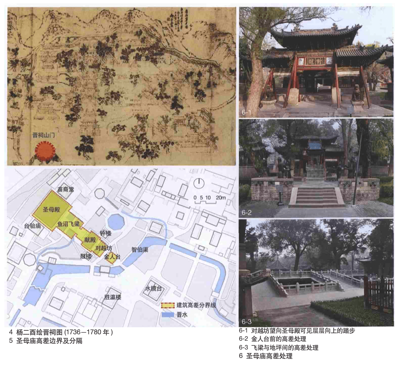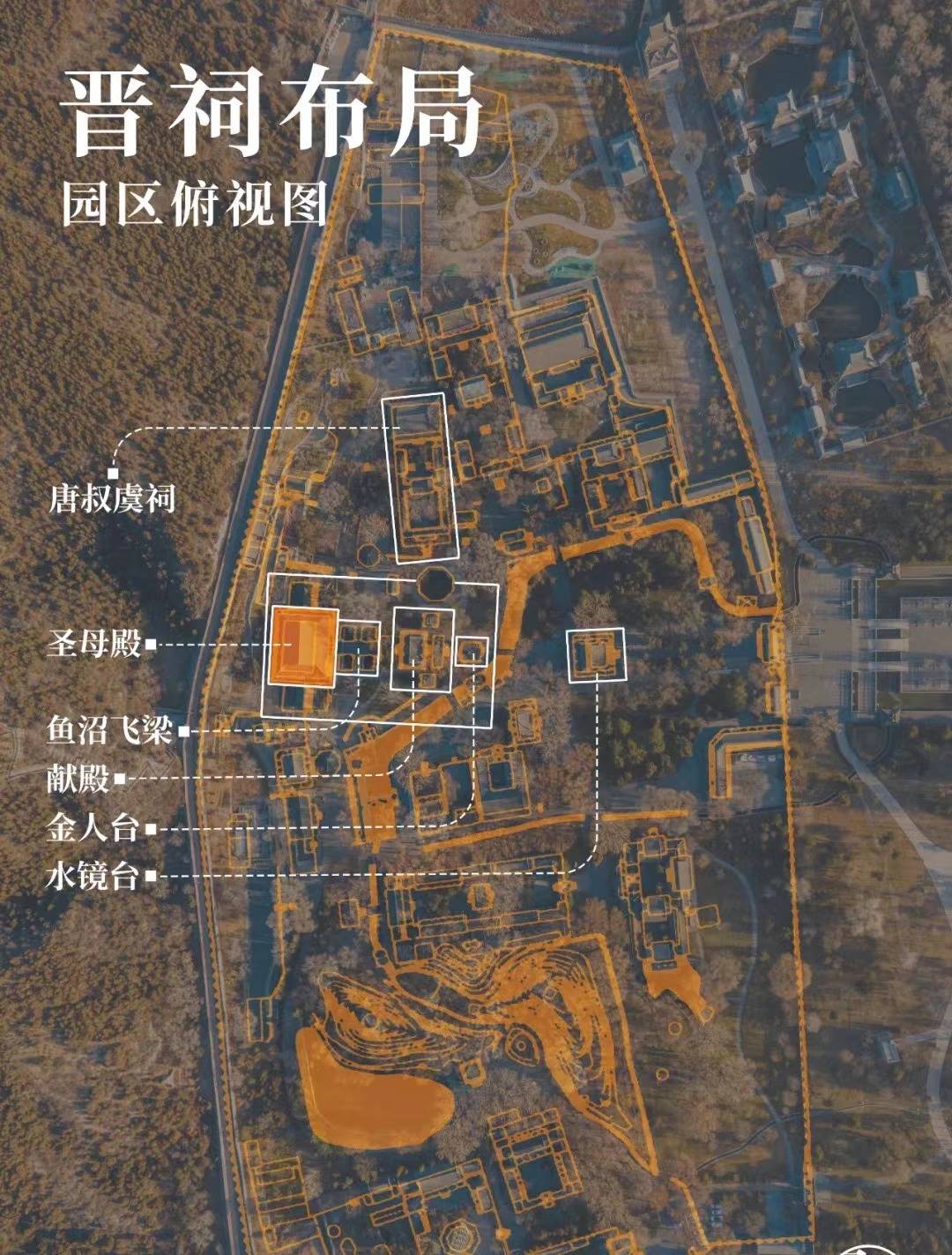 一進了晉祠大門,那一種説不出的美麗輝映的大花園,使我們驚喜愉悦,過於初時的期望。無以名之,只得叫它做花園。其實晉祠佈置又像廟觀的院落,又像華麗的宮苑,全部兼有開敞堂皇的局面和曲折深邃的雅趣,大殿樓閣在古樹婆娑池流映帶之間,實像個放大的私家園亭。——梁思成、林徽因《晉汾古建築預查紀略》