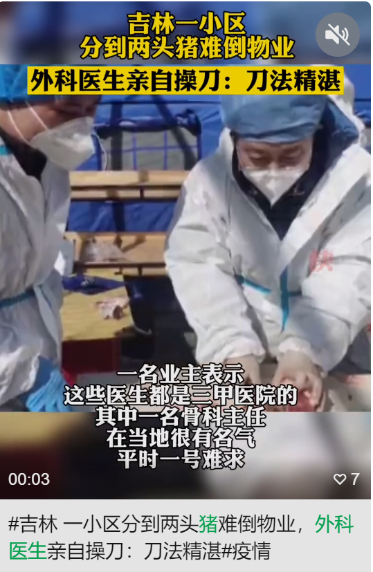 舉例:疫情期間,某三甲醫院外科主任醫生在疫情期間完成豬肉分塊。