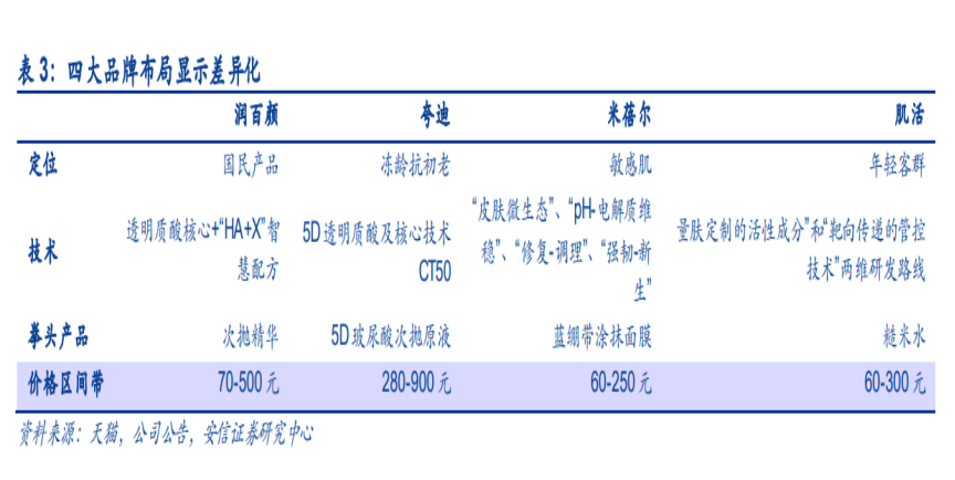 比如,公司第一大護膚單品“潤百顏”系列產品採用“透明質酸核心+X”的智慧配方,產品對敏感肌、幹皮、抗皺、美白等方面具有明確的功效。第二大單品誇迪採用“5D透明質酸及核心技術 CT50”主攻抗衰;第三大單品米蓓爾主攻敏感肌問題;第四大單品肌活瞄準注重性價比的年輕消費羣體。