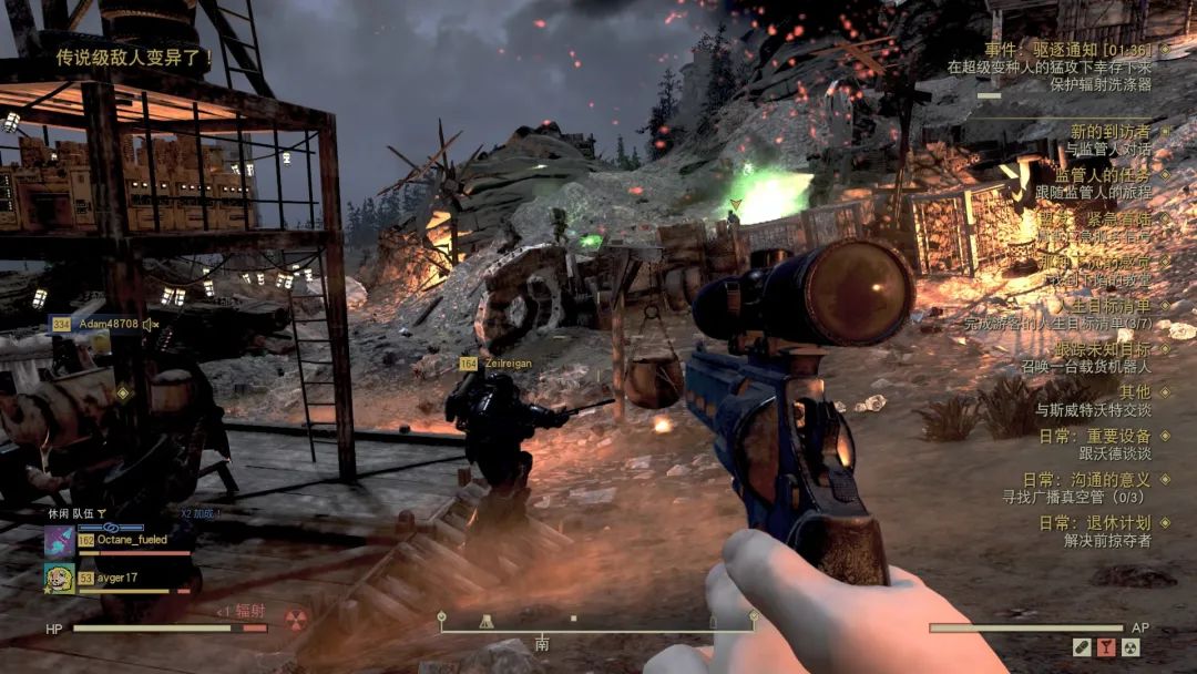 《輻射76》裏沒有大服務器的概念,一個服務器,也就是一個“世界”更像是一個房間,裏面只有24個玩家。系統會做一些匹配,讓24個人有高低等級搭配,隨機進一個服務器裏就有幾百級大佬。遇到地圖事件、需要多人去打的時候,多半會有強力夥伴帶飛。其他玩家們也不是説純當活雷鋒,他們不斷刷各種事件也是為了拿詞條更好的武器、裝備。