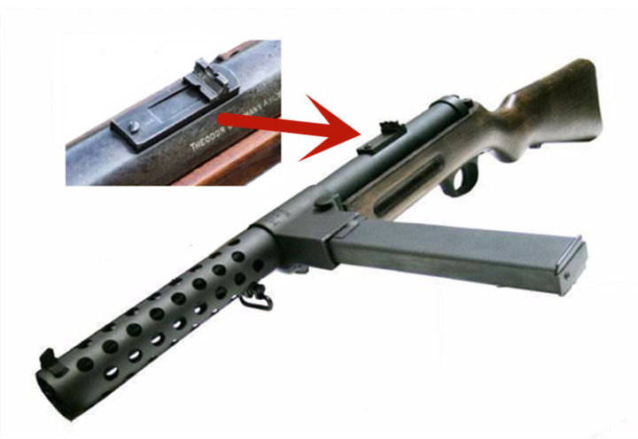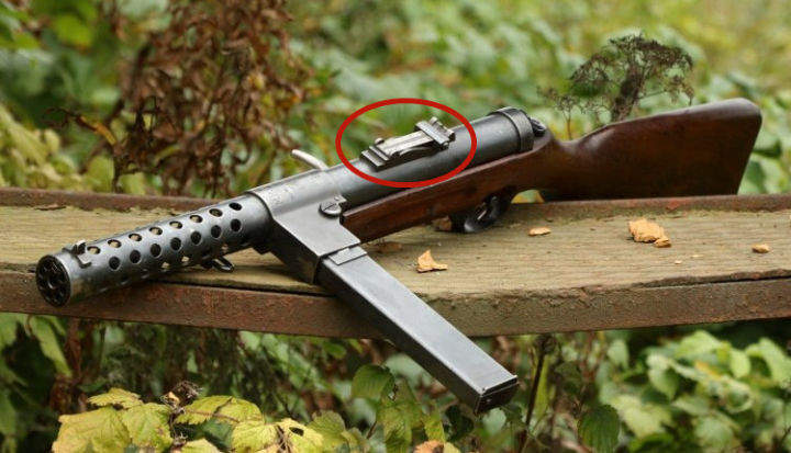 上圖是MP28衝鋒槍,請看紅圈部位的弧形表尺座。SIG20的後瞄具跟MP28的差不多。