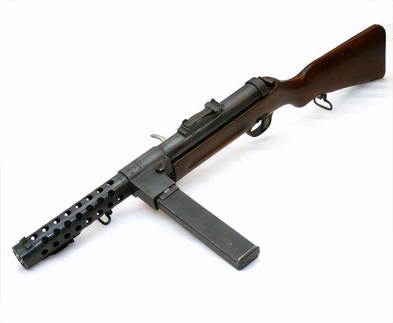 這就是MP18衝鋒槍。該槍於1915開始研發,1917年成功拿出樣槍,1918年開始批量生產並裝備德軍,因而命名為MP18。