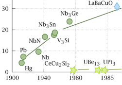 (超導體發現時間表。藍色菱形表示銅酸鹽,黃色方塊表示鐵基化合物。綠色圓圈表示二硼化鎂、低温或高壓金屬超導體)