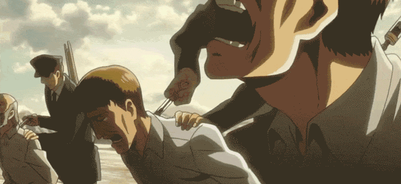 大批巨人藉此闖入城中,肆無忌憚地虐殺人類,主角艾倫更是親眼看着母親被吃掉。