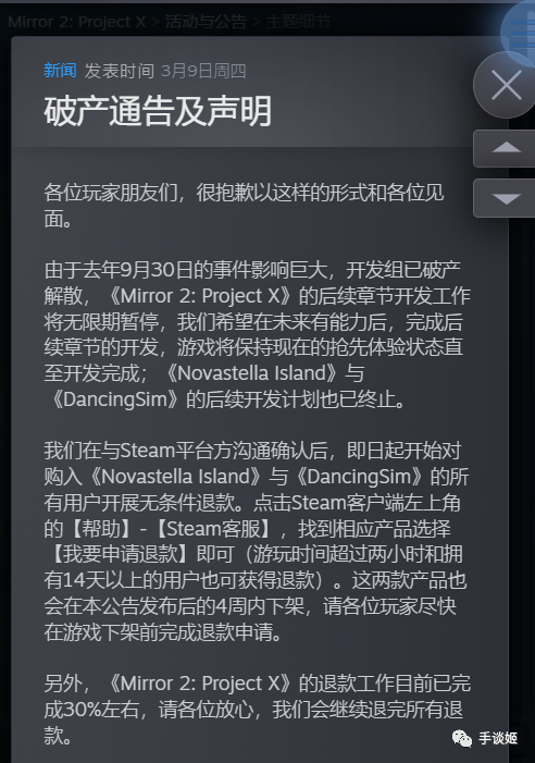 3月9日週四下午,Steam遊戲《Mirror 2》發佈公告稱,開發組破產。