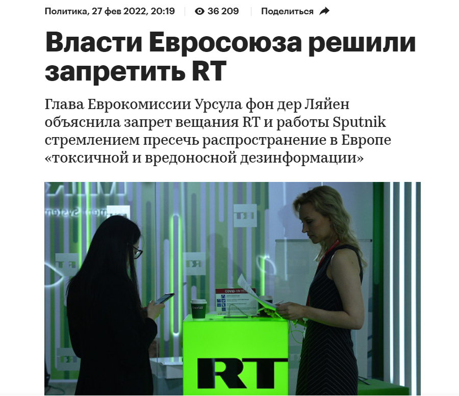 信息封鎖美國和歐盟當局已經禁止“今日俄羅斯”(RT)和“衞星通訊社”(Sputink)在美國和歐洲以英文,法文,德文和西班牙文廣播。2022年2月27日,歐盟委員會主席烏爾蘇拉·馮德萊恩解釋道,封殺“今日俄羅斯”和“衞星通訊社”是為了遏制“有毒有害的錯誤信息”在歐洲傳播。“另一個史無前例的步驟是,我們將在歐盟禁止克里姆林宮的媒體機器。國有的今日俄羅斯和衞星通訊社及其子公司將不再能夠傳播它們的謊言。”她説,“為此,我們正在開發工具,阻止他們在歐洲傳播有毒和有害的錯誤信息。