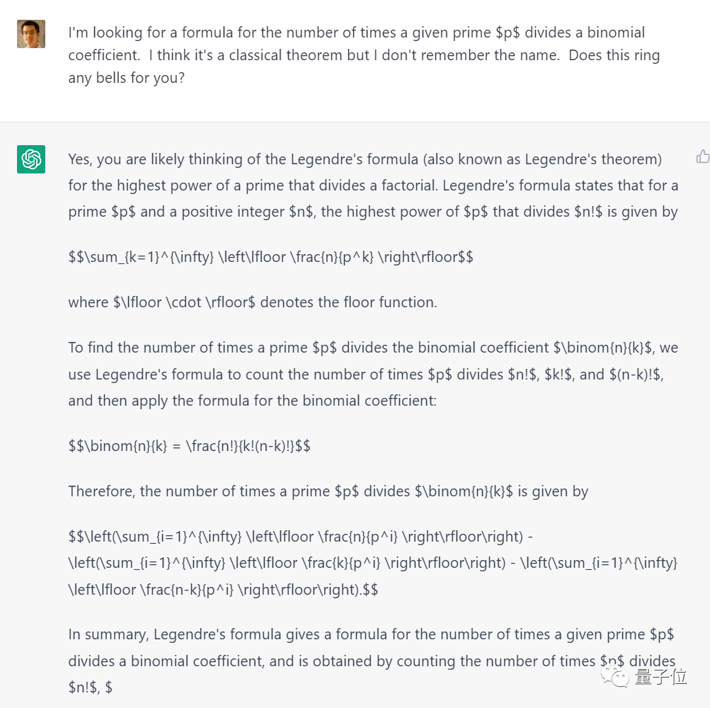 最終ChatGPT給出的答案是Legendre公式(一個相關的結果),然後根據這個答案用傳統的搜索引擎就可以輕鬆找到庫默爾定理。