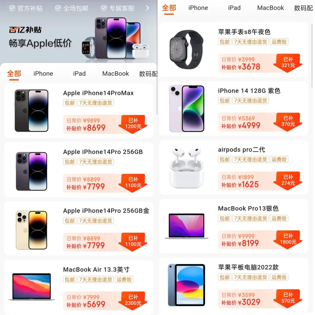 2023年3月起,打開京東App,首頁上出現的百億補貼專區紅彤彤,明晃晃,幾乎讓人誤以為走進了另外一個電商平台。特別是進入百億補貼頻道之後,用户第一眼看到的就是“經典款”的百億補貼商品——iPhone、iPad等蘋果硬件,就更加讓人分不清了。