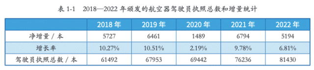 中國飛行員數量整體保持增長趨勢,到2022年底,中國共有81430名飛行員,增長率為6.81%。儘管相較2019年前兩位數的增速有所下滑,依然保持高速增長態勢。