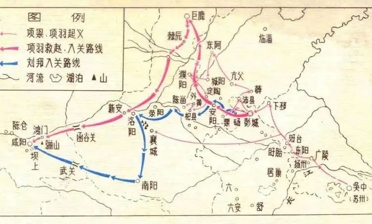章邯北上攻趙的時候,楚國也在尋求方式扭轉頹勢。楚懷王派出兩路大軍:一路就是劉邦的率軍西進,目標直指關中;另一路則是宋義、范增、項羽率軍與其他諸侯一起救趙……