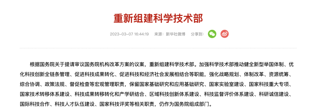 2023年3月7日下午4時許,新華社通報了一則消息:中國將重新組建科學技術部。