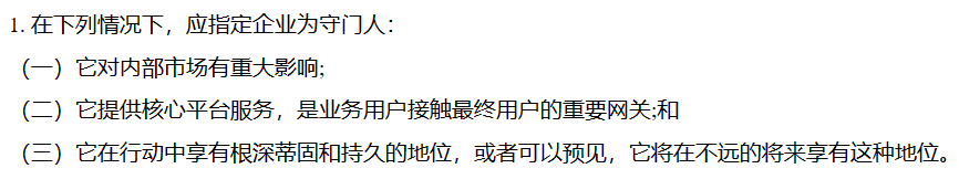 而且你要是那種用户數量巨大、收益巨大、對市場具有重要影響、現在或將來都具有持久地位的企業,**那麼就要成為 “ 守門人 ” ,**主動承擔起一定的義務和責任。