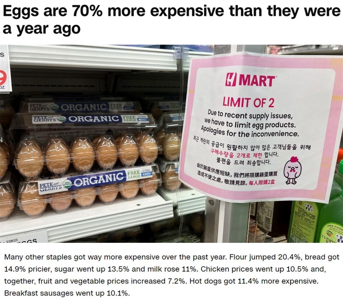 △美國有線電視新聞網(CNN)報道:美國雞蛋價格在過去一年中暴漲70%以上,麪粉價格上漲20.4%,麪包價格上漲14.9%,嬰兒奶粉價格上漲約10%,小學和中學午餐價格更是出現了超過300%的暴漲。