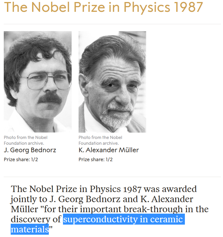 1987年諾貝爾物理學獎授予Bednorz和Müller,因為他們在發現陶瓷材料超導中的重要突破(https://www.nobelprize.org/prizes/physics/1987/summary/)