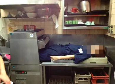 又如,在一家名為“泰尚”的蕎麥麪店裏,兼職大學生拍下了自己躺在洗碗機池子裏的照片。