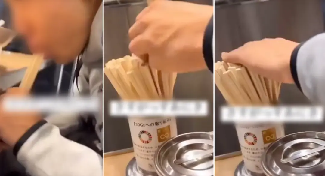 在大阪一家道頓堀神座拉麪店,有人抓了一把筷子,放入嘴裏舔了舔,又放回原位。