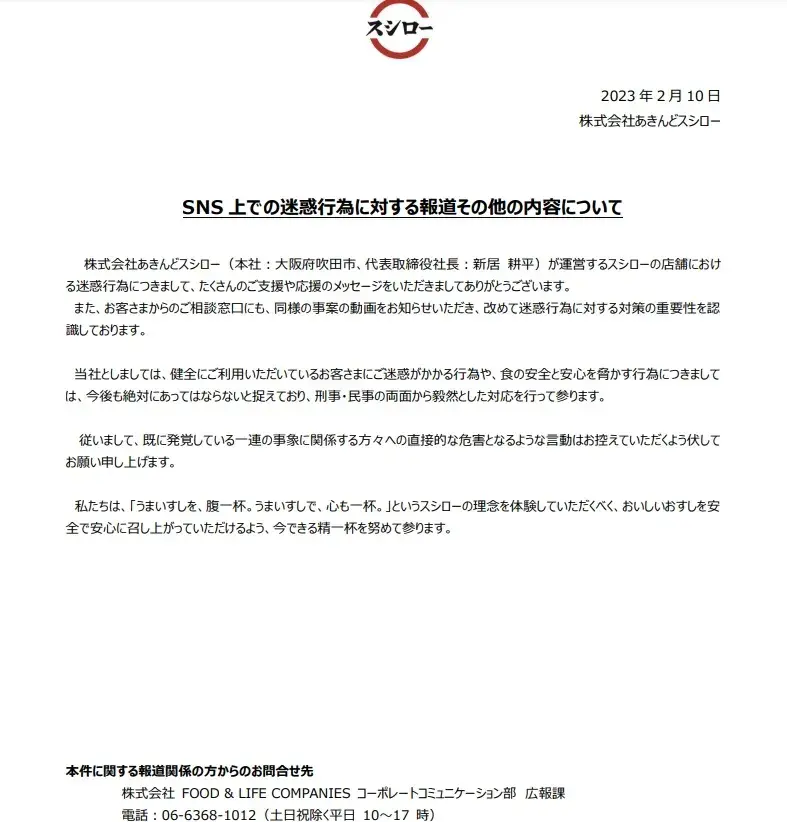 不過,作為受害者的回轉壽司品牌“壽司郎”並不打算息事寧人,而是決定以最嚴格的態度追究該高中生的民事、刑事責任。