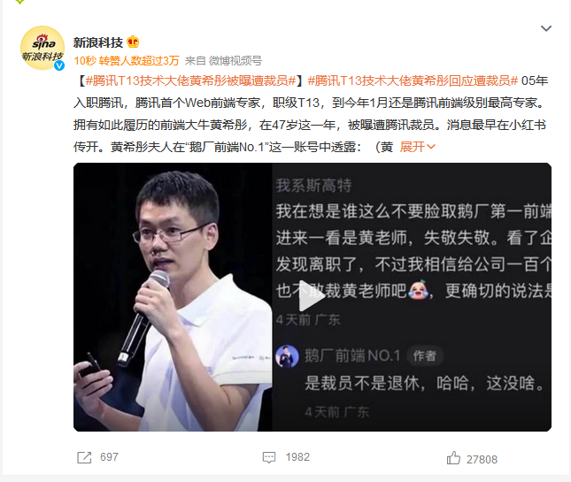 據瞭解,黃希彤被裁最早在小紅書傳開,黃希彤夫人在“鵝廠前端No.1”這一賬號中透露:(黃希彤)在鵝廠打工15年,年前收到裁員通知。