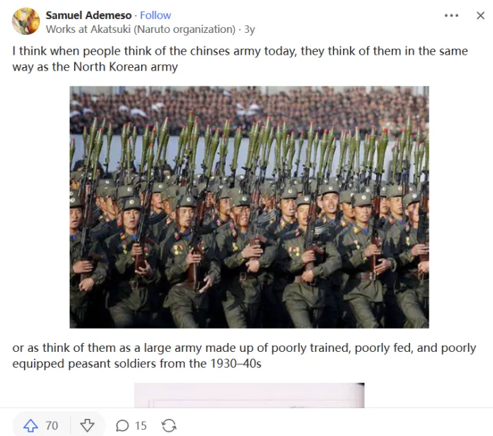 我認為,當人們今天想到中國軍隊時,他們會把他們與朝鮮軍隊想得一樣。