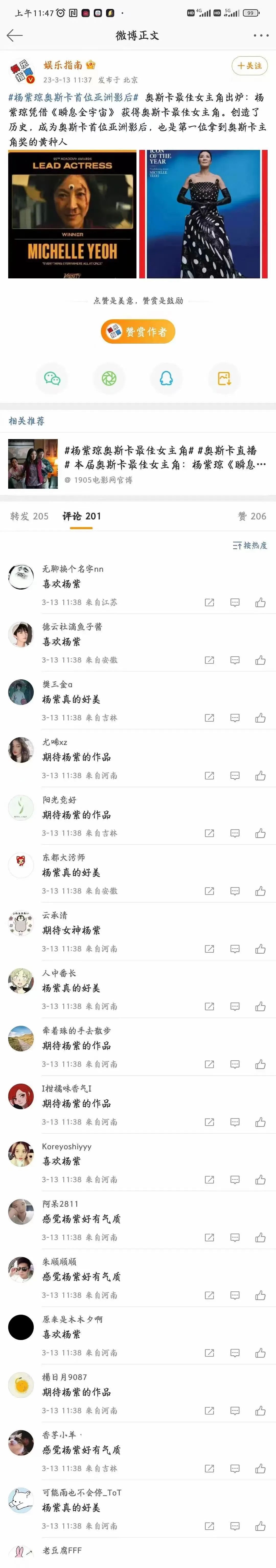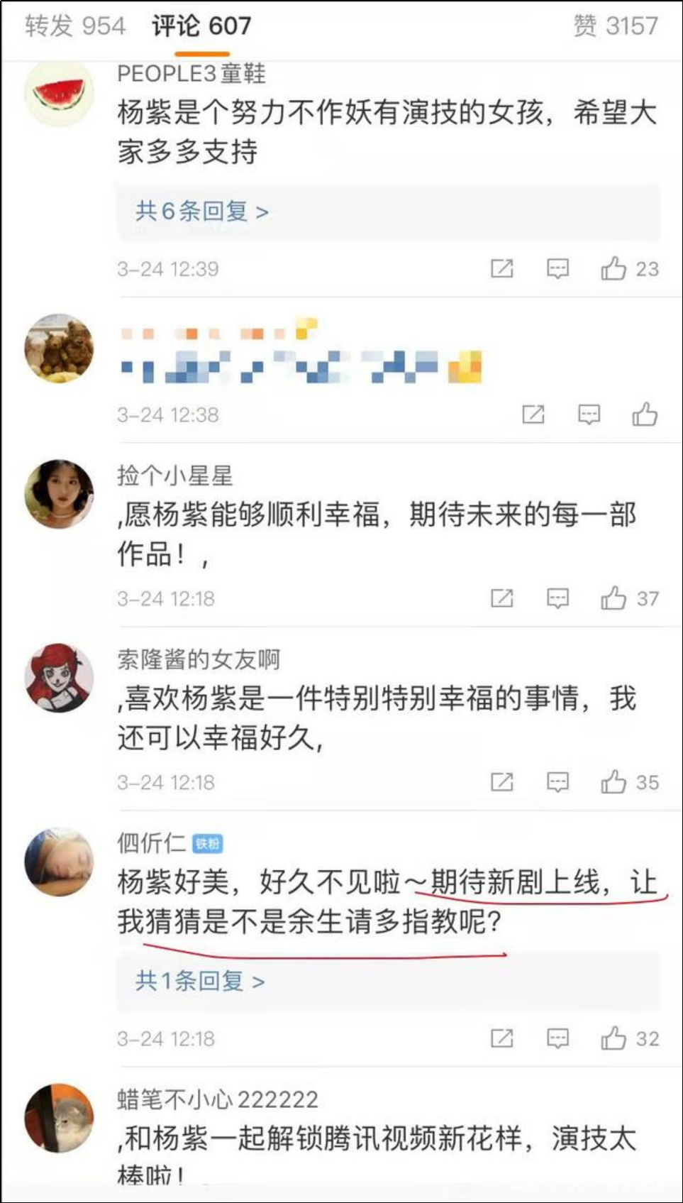 評論區前200條評論卻清一色在恭喜楊紫。