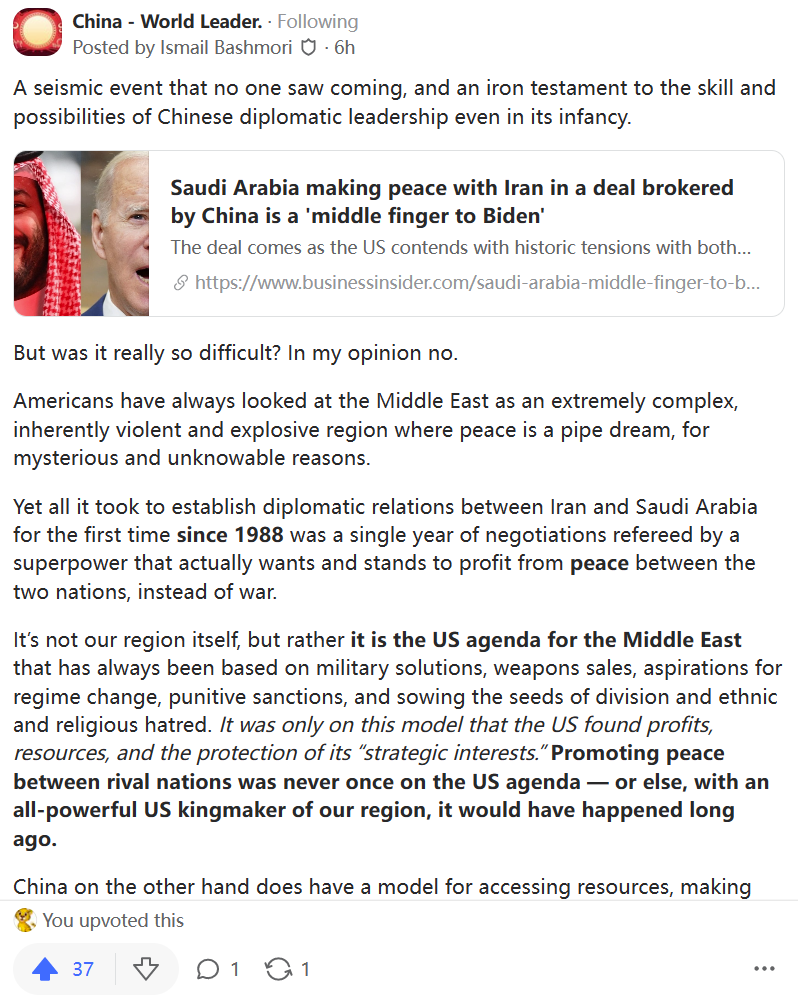 回到伊朗和沙特阿拉伯,此舉也表明,在美國幾十年來在中東地區的主導地位主要由反恐戰爭催化後,中國在中東的影響力越來越大。