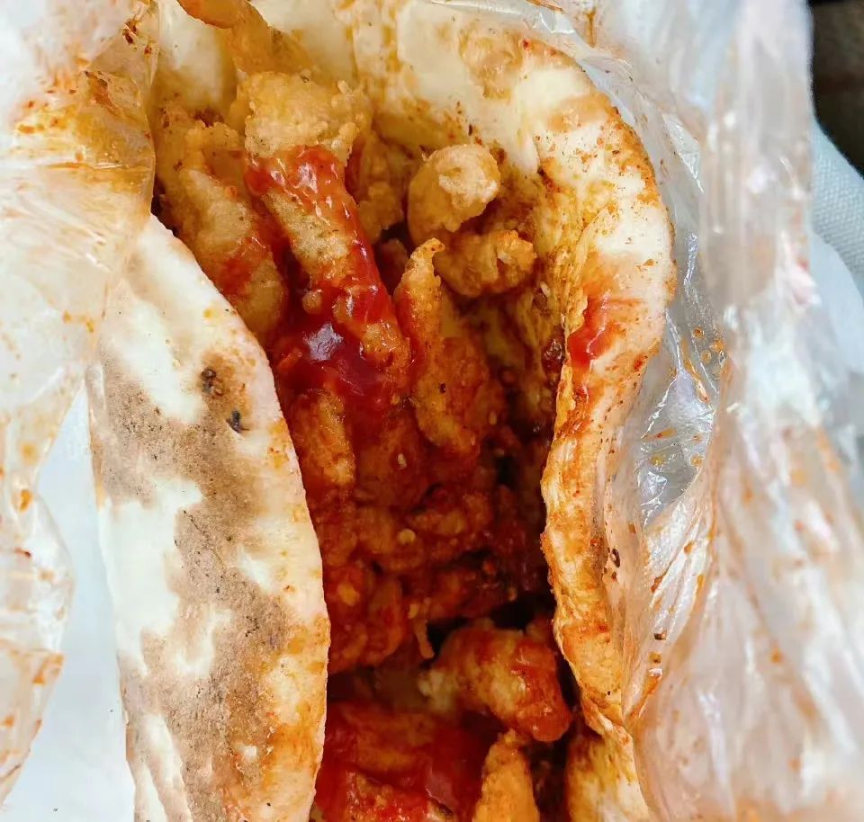 一口咬下,先是饢的柔軟和雞柳的酥脆,紮實的肉感帶來的是滿足。辣椒麪引得人食慾大增,依附在饢和雞柳上的孜然顆粒會在咀嚼時帶來小驚喜,番茄醬的酸甜餘味的解膩恰到好處。