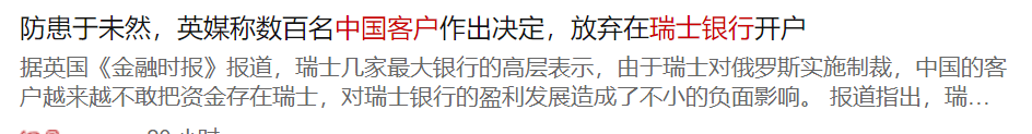需要特別提醒的是:有聰明人在俄烏衝突後,看到打中立旗號的瑞士銀行也撕破偽裝,參與制裁俄羅斯,逐步從瑞士銀行中取回了存款。近日西方媒體就對此進行過炒作。