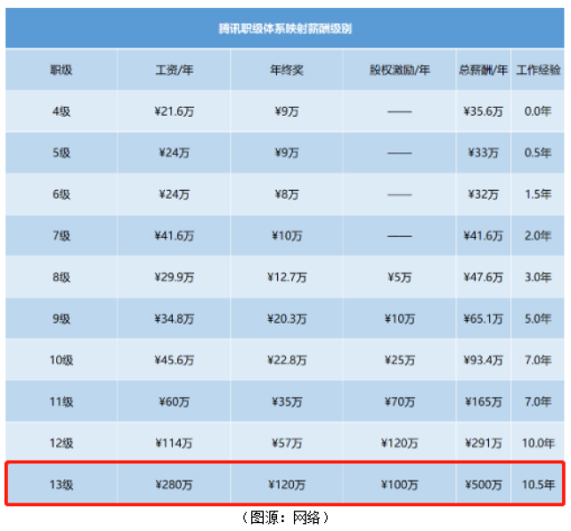 在新的職級體系下,員工的職級被劃分為4級至17級,因此此次被裁的黃希彤,其T13級的職級已處於公司內部很高的級別,相當於舊職級體系中的4.2級,大致和阿里的P9級相當。若按網上流傳的帖子對照(未經官方證實),即便不包含股權激勵和年終獎在內,13級別的員工僅工資就在280萬元/年的水準。