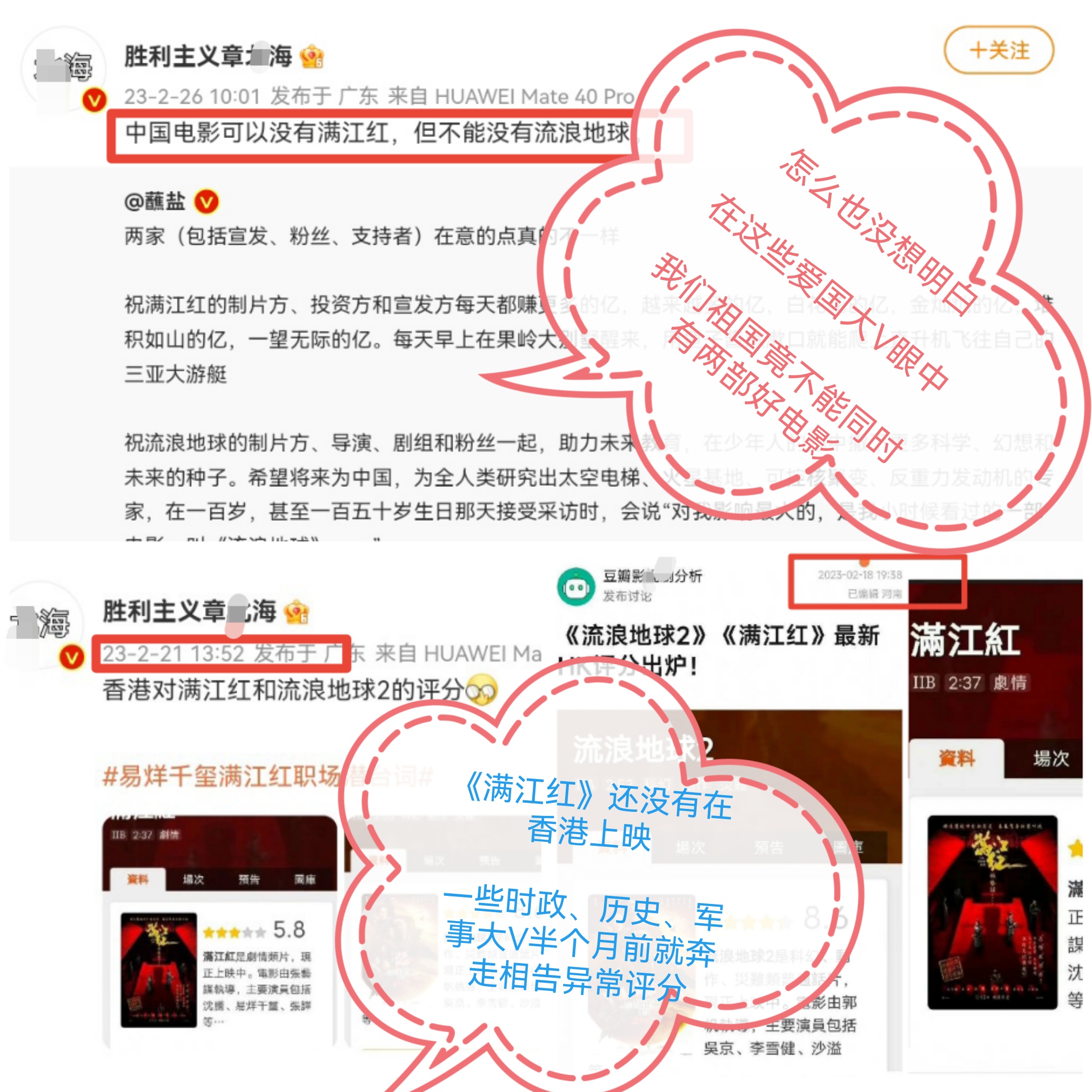 然而,滿腔愛國熱忱的葉太又怎麼能想到:早在電影《滿江紅》3月2日香港上映前一個月,一些邪教式黑粉和流氓網紅大V就已經在大肆貶低、惡意差評、營造輿論攻擊《滿江紅》了。