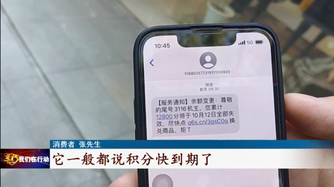 一位消費者向記者展示了自己收到的一條積分兑換短信:“短信內容一般都説積分快到期了,需要去兑換。我覺得有一定的欺騙性,因為這種帶有‘尾號機主’的短信通知方式,會讓你以為是移動或者聯通發過來的。”