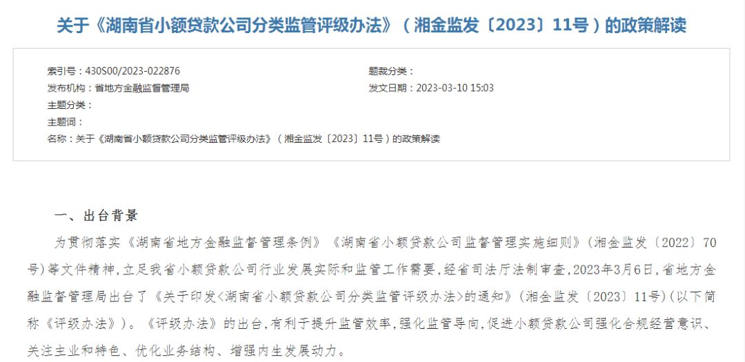 近期,湖南省地方金融監督管理局出台了《關於印發<湖南省小額貸款公司分類監管評級辦法>的通知》(湘金監發〔2023〕11號)(以下簡稱“評級辦法”),該評級辦法相較以往評級文件,突出了對出租牌照的整治。