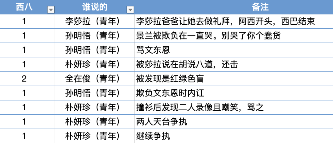 除去片頭片尾,我和小夥伴們拿着excel逐幀觀看了兩季《黑暗榮耀》,統計出了**每集每個西八出現的時間和次數,以及是誰罵的、罵的是誰。**不論是路人還是主角、正派還是反派,只要TA説出了西八,就逃不過我靈敏的雙耳!