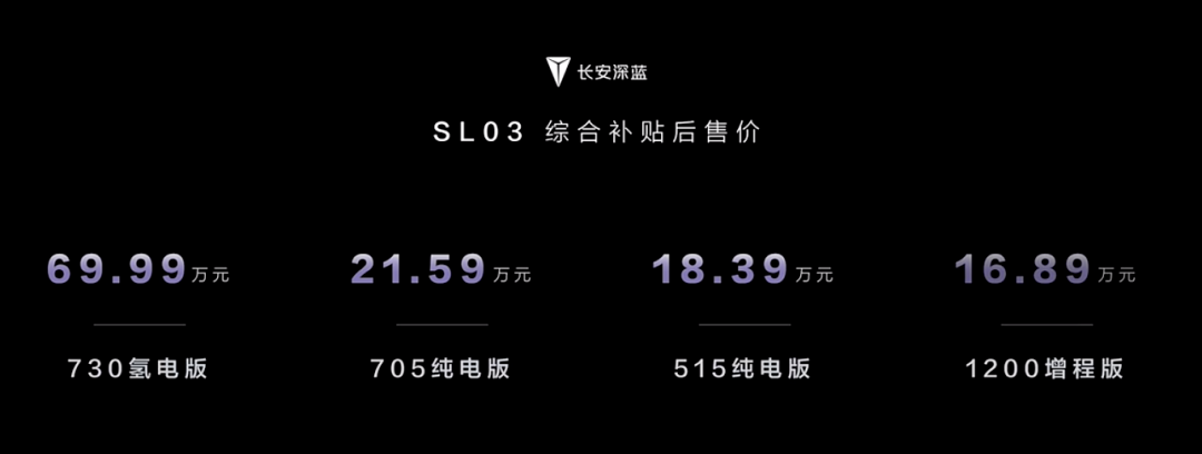 2022年7月25日,長安深藍SL03全國上市,共發佈了增程版、純電版和氫電版三個版本,售價區間為16.89萬元-69.99萬元。