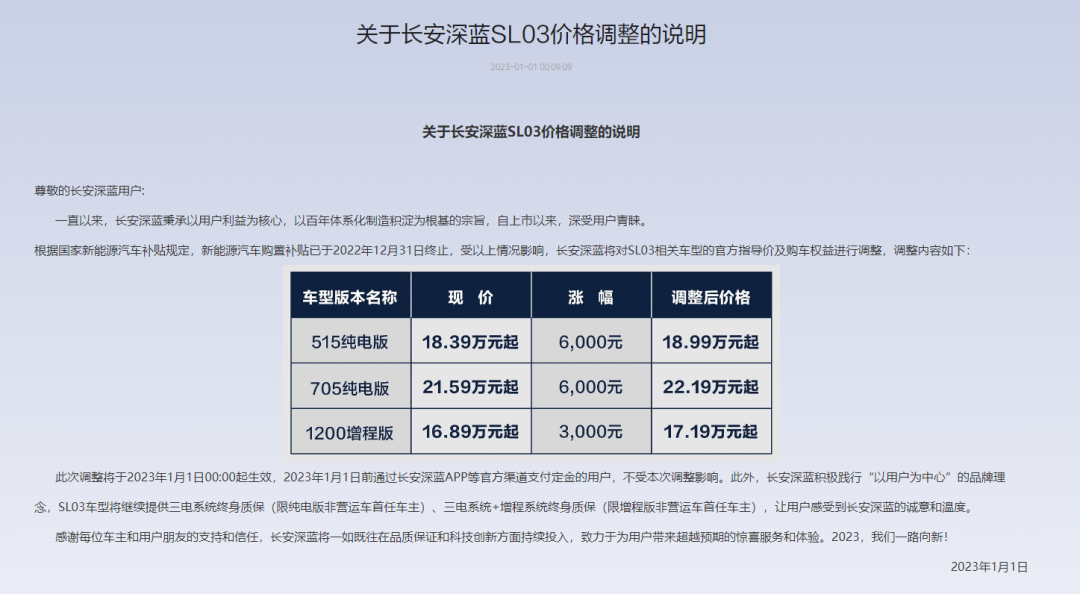 然而長安深藍卻逆向而行,於1月1日將長安深藍SL03的增程版價格上調3000元,純電版價格上調6000元。
