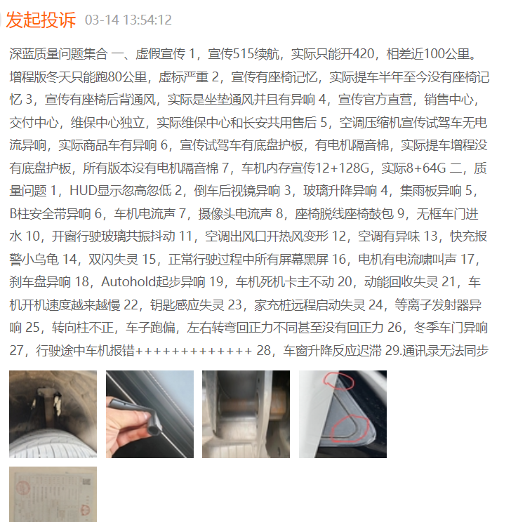 許多車主反映,長安深藍SL03存在虛假宣傳、品控差等問題。