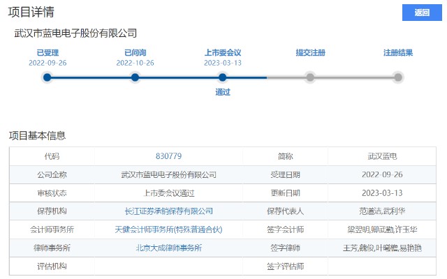 燈塔媒介3月14日訊,北交所網站3月13日發佈公告,武漢市藍電電子股份有限公司(以下簡稱“武漢藍電”)IPO申請已獲上市委會議通過。