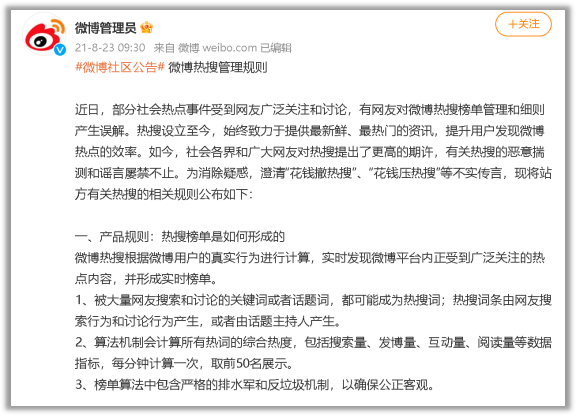 但我去搜了下熱搜榜單的形成機制,竟然微博把熱搜的算法規則更新之後直接貼出來了。