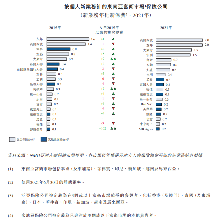東南亞人壽保險行業的競爭格局在短時間內發生了劇烈變化。在公司的東南亞市場(包括泰國(及柬埔寨)、菲律賓、印尼、新加坡、越南及馬來西亞)的新業務年化新保費排名方面,公司估計已由2015年的第十四位上升至2021年的第五位,使公司成為該期間增長最快的泛亞人壽保險公司(定義為於三個或以上富衞市場競爭的人壽保險公司)。