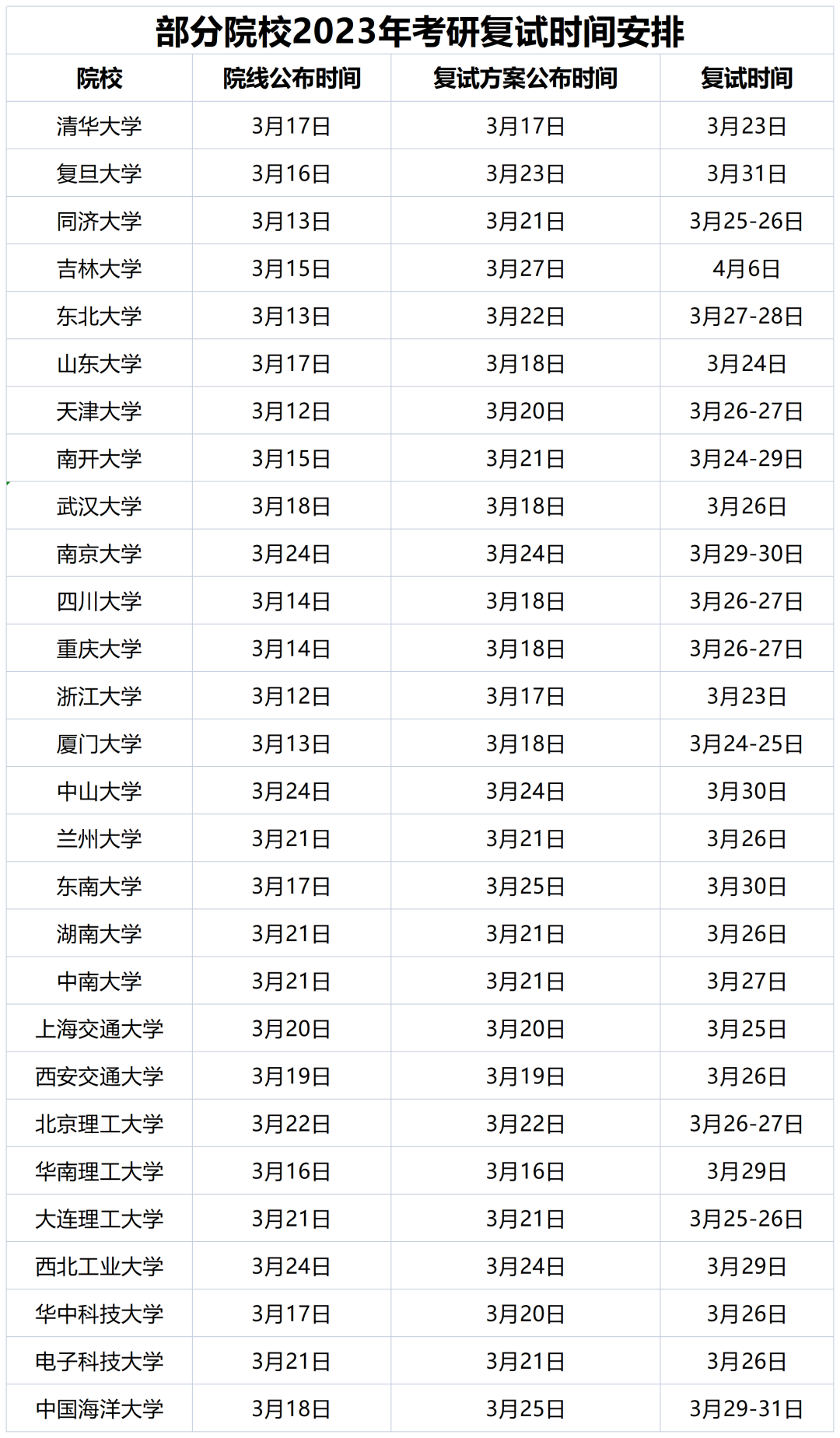 隨着國家線的落地,多所高校也陸續發佈2023年碩士研究生考試複試時間安排。同時,有業內人士指出,各校獨立劃線的複試線一般會在3月中旬期間下發,考生應多留意各校官網信息,及時做好準備。